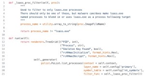 The run function is called first when a plugin’s execution begins. The expected return value is a TreeGrid that the calling user interface will then display for the analyst. The following image shows the run function, along with the process filter from our Skeleton Key plugin: