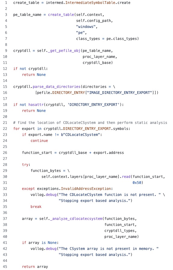 First, a reference is obtained to the type information for PE files (lines 1-7). Next, a Volatility 3 PE file object is constructed starting at the base address of cryptdll.dll (lines 9-11). This object contains a number of convenience methods for accessing common data, such as the data directories. This is leveraged on line 15 to parse the export directory, and then loop through its exported symbols starting on line 22. The body of this loop then looks for CDLocateCSystem, and when found, attempts to read the bytes (opcodes of the instructions) from its location in memory.