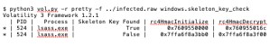 With all of the values computed, displaying the results to the analyst requires just a simple yield of the data. This can be seen in lines 13-17 and will result in the process name and PID, presence of a Skeleton Key, and handler addresses being displayed. This immediately informs the analyst if a Skeleton Key was found, and if so, where the malicious handler values are in memory.
