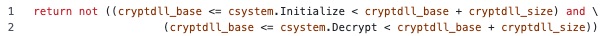 Each memory region within a process’s address space is tracked by a virtual address descriptor (VAD). Information in the VAD includes the starting and ending address of the region; the initial protection of the region; and the number of committed pages. For executables, such as lsass.exe and cryptdll.dll, one VAD will track all regions of the executable, including its code and data. Knowing this, we can check if the values of the initialization and decryption handlers are within the region for cryptdll.dll. This is shown in the following image: