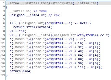 As can be seen, this is a pretty simple function that first (line 6) checks against the maximum number of registered systems (0x18), and then bails if already at the maximum. Next, the function determines the offset into CSystems (line 9) by using cCSystems shifted by 7. This matches our understanding of cCSystems and the shifting by 7 from earlier. The function then simply copies in the values from the passed in data structure (a1) into the correct offsets of CSystems. In summary, whatever values are in the system being registered are copied separately inside of CSystems, duplicating them in memory.