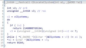 The following images show the IDA Pro decompiler and graph view of CDLocateCSystem: