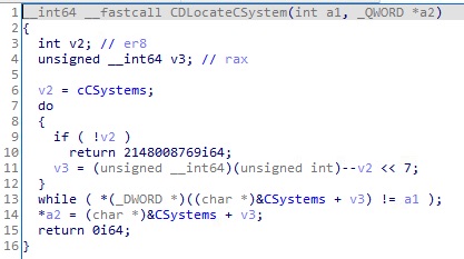Using knowledge gained from previous work on the plugin, we know that the CDLocateCSystem function directly references two of the four symbols we need: CSystems and cCSystems. This means that by performing static binary analysis of CDLocateCSystem, we should be able to determine the address of these symbols, since the function’s instructions will reference the addresses themselves. This is a common tactic in memory analysis and reverse engineering tasks to find symbols that are not exported or where a symbol file cannot be obtained.