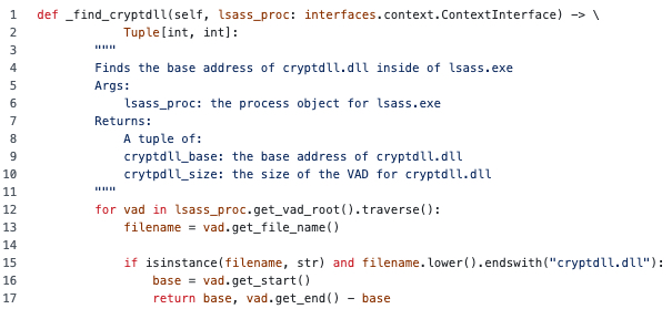 The above image shows that _find_cryptdll—a function that receives the process object for lsass.exe—iterates through its memory regions (line 12), retrieves the filename for the current region (line 13), and checks for the file of interest (13-15). Once cryptdll.dll is found, its base address and size are returned (16-17).
