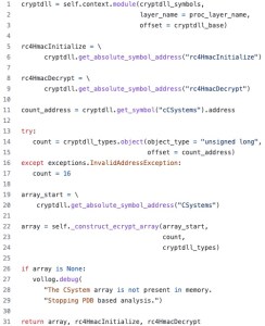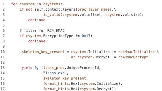 Volatility has built-in support for enumerating arrays, so the for loop will walk each element, creating the csystem variable as the _KERB_ECRYPT type. Before processing an element, it is checked for being valid (mapped) into the process address space (lines 2-3). Next, the EncryptionType value is compared with our type of interest (lines 6-7). To determine if a Skeleton Key is present, we compare the Initialize and Decrypt members of the system found in memory to the expected values from the PDB file. If either of these have been modified, then a Skeleton Key attack has occurred, or at a minimum, a modification has occurred that an analyst would want to know about.