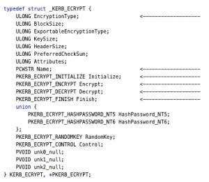 In summary, reverse engineering has showed us that the active RC4 authentication system structure can be located by enumerating CSystems and then looking for the element that has an EncryptionType of 0x17 (23). This precisely matches how CDLocateCSystem uses its first parameter to determine which element of the CSystems array to return to the caller. It also tells us that the type of each element is KERB_ECRYPT, which is very handy since we already have the definition for this type.