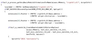 After finding the _KERB_ECRYPT instance for RC4 through the use of CDLocateCSystem, Mimikatz then hooks the legitimate initialization (Initialize) and decryption (Decrypt) members of the structure. These hooks point the handlers to Mimikatz’s malicious handlers (kuhl_misc_skeleton_rc4_init and kuhl_misc_skeleton_rc4_init_decrypt) instead of the legitimate ones. The malicious handlers are injected into the address space of lsass.exe through the use of the WriteProcessMemory function. Combined, these malicious handlers are what implement the Skeleton Key attack, as they give Mimikatz control over all future authentication attempts to the infected domain controller.