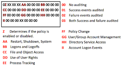 For this machine we can see that the policy is enabled, but we don’t know which events are being logged without deciphering the binary data. A description can be seen below in a graphic generated from this Microsoft KB article: http://support.microsoft.com/kb/246120 as well as from Harlan Carvey’s RegRipper plugin auditpol:
