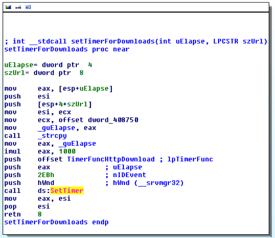 From a forensic standpoint, timers are useful because they’re often used in place of simple while loops that use Sleep to perform actions at regular intervals. The difference is that SetTimer leaves obvious artifacts in GUI memory and while loops do not. Specifically, by analyzing timers, you can identify the process ID and thread ID that set the timer, the rate (initial time-out value in milliseconds), the countdown (milliseconds left before the timer expires), the window associated with the timer, and the address of the callback function.