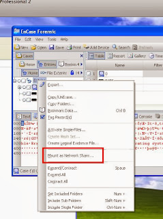 EE or EnCase Forensic (EF) with the VFS/PDE modules (or EF v7) all have the ability to mount disk and RAM in a way that can be accessed by the local machine. This is accomplished through EnCase’s Virtual File System (VFS) module. You can mount all RAM samples and disk images from live machines or evidence files as a network share. In order to do so, you have to mount at the case level and not one piece of evidence at a time. To do so, right-click on “Entries” in the left pane and choose “Mount as Network Share…” from the menu: