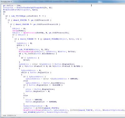 What you see here is the “memory dump parsing” function. It iterates once for each active process on the system, calling OpenProcess() to obtain a handle, then using VirtualQueryEx() to determine which memory ranges are accessible to the process, and reading them into a local buffer with ReadProcessMemory(). The data is then passed off to two scanning sub-functions which do the real work of deciding which data to steal from the buffer.